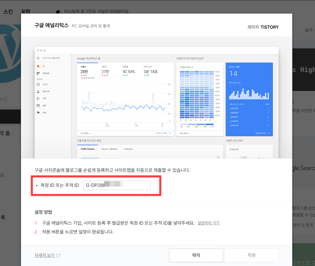 티스토리에서 구글 애널리틱스 플러인을 사용하는 경우 측정 ID 또는 추적 ID에 이 코드를 입력할 수 있습니다.