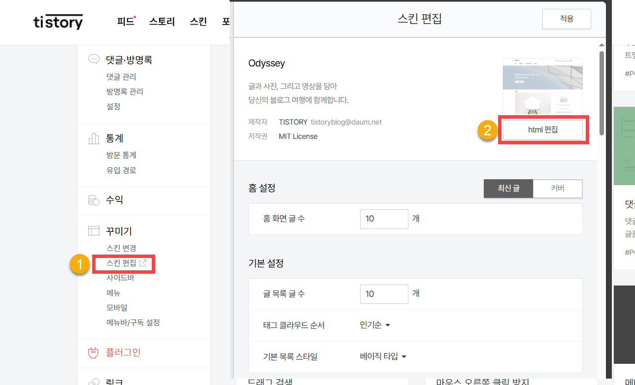 티스토리 관리자 페이지에 로그인한 다음, 꾸미기 » 스킨 편집을 클릭하고 스킨 편집 화면에서 html 편집 버튼을 누릅니다.