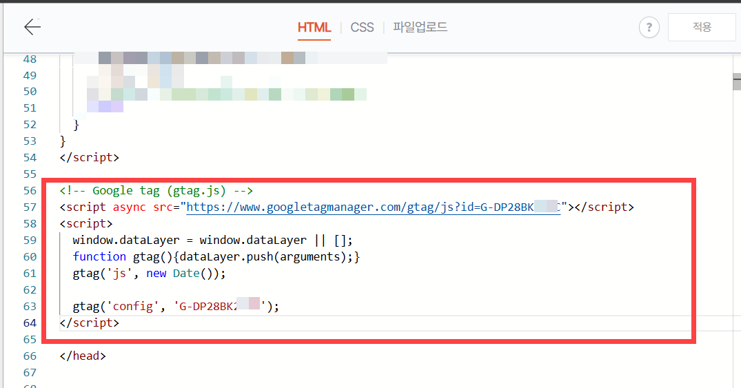 스킨 파일 편집 화면이 표시되면 HTML 탭에서 <head>...</head> 사이에 구글 태그를 입력합니다.