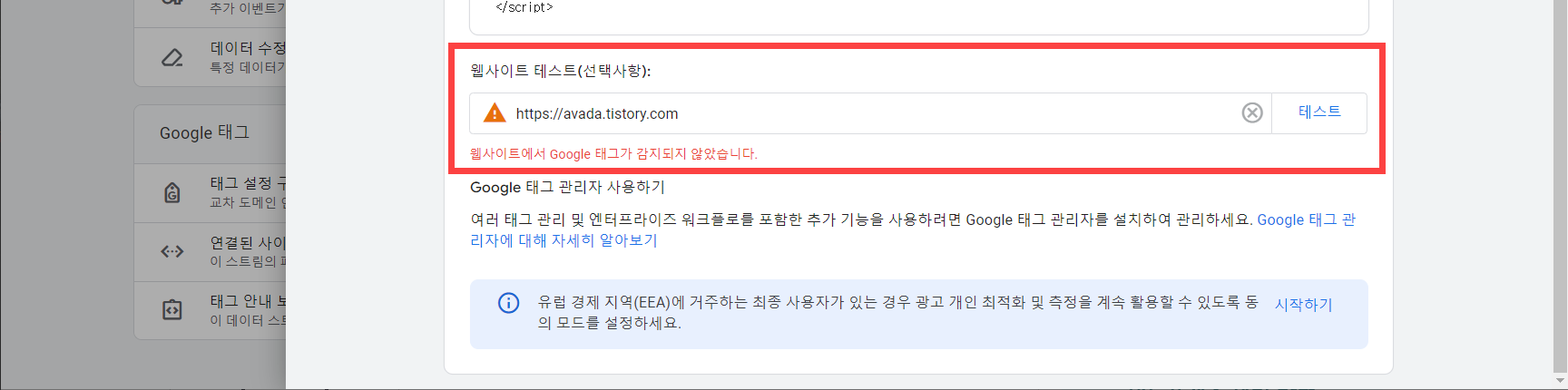 Google 태그가 감지되지 않으면 "웹사이트에서 Google 태그가 감지되지 않았습니다" 오류가 표시됩니다.