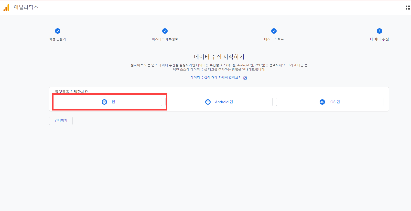 기본적으로 계정 생성 » 속성 만들기 » 비즈니스 세부정보 » 비즈니스 목표 » 데이터 수집 순으로 진행이 됩니다.