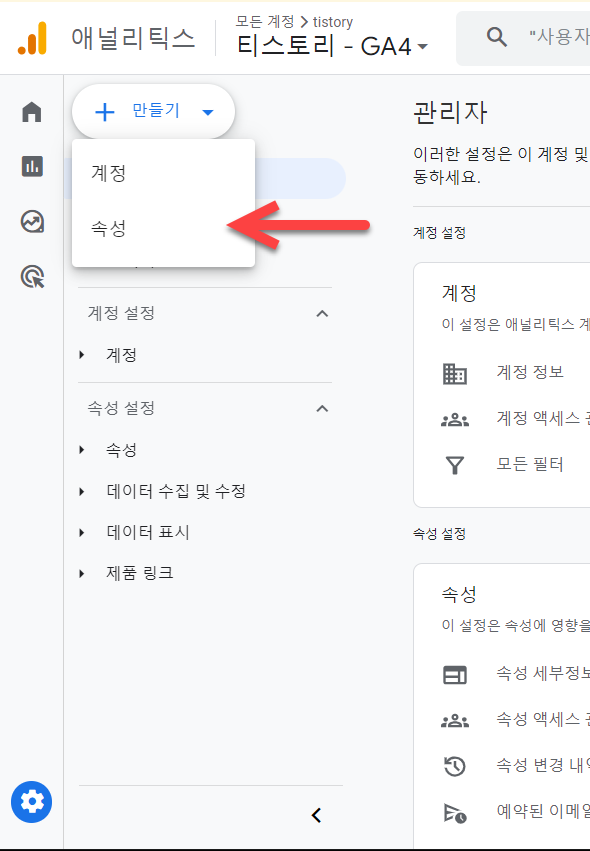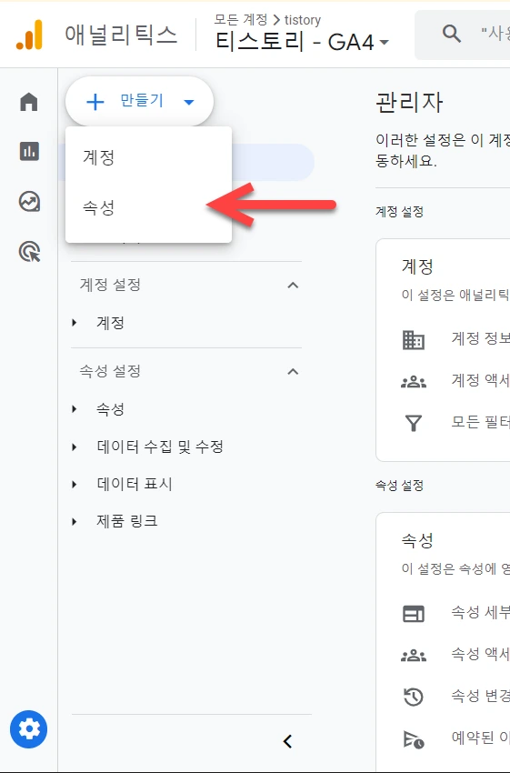 위의 화면을 찾기 어려운 경우 해당 계정 내의 아무 속성을 선택하고 만들기 » 속성을 선택하여 속성을 만들 수 있습니다.