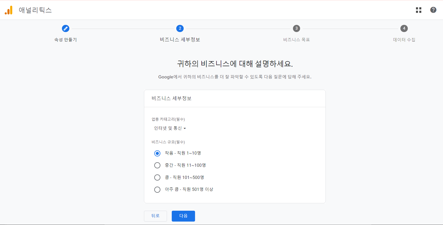 업종 카테고리를 선택하고 비즈니스 규모를 지정합니다. 저는 블로그라서 작음 - 직원 1~10명을 선택했습니다.😄