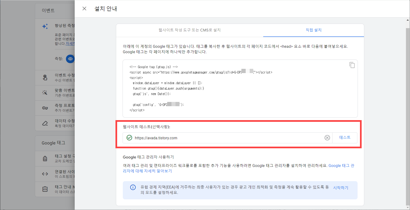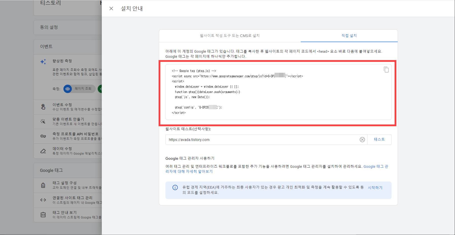 대신 직접 설치에서 구글 태그(추적 코드)를 복사하여 티스토리 스킨 파일에 추가하시기 바랍니다.