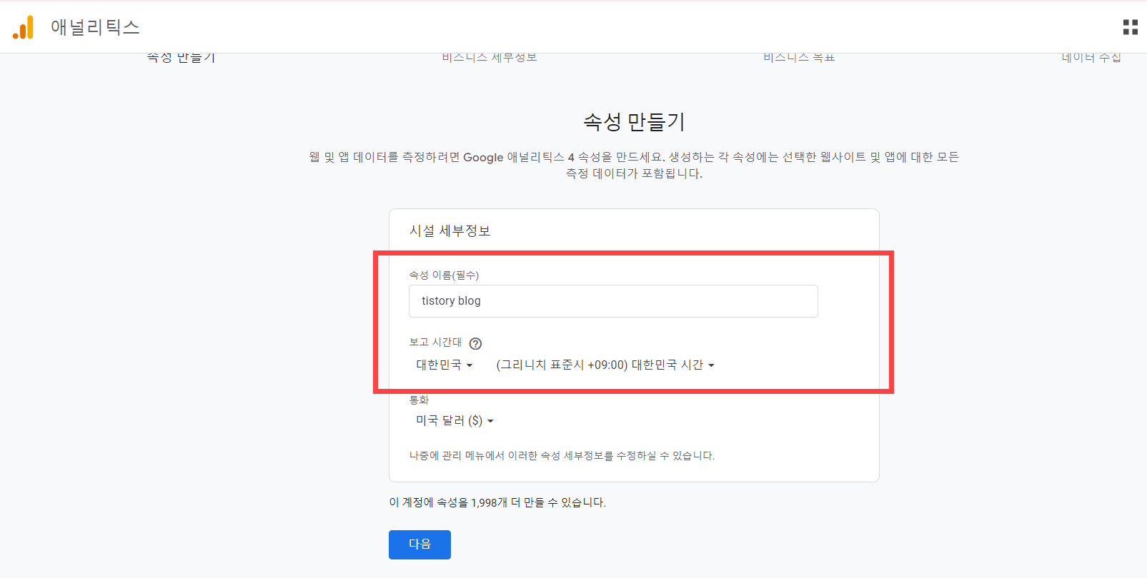하나의 계정에 여러 개의 속성을 추가할 수 있습니다. 보고 시간대를 적절히 선택(예: 대한민국)하고 통화는 미국 달러($)로 그대로 두면 될 것 같습니다. 다음 버튼을 클릭합니다.
