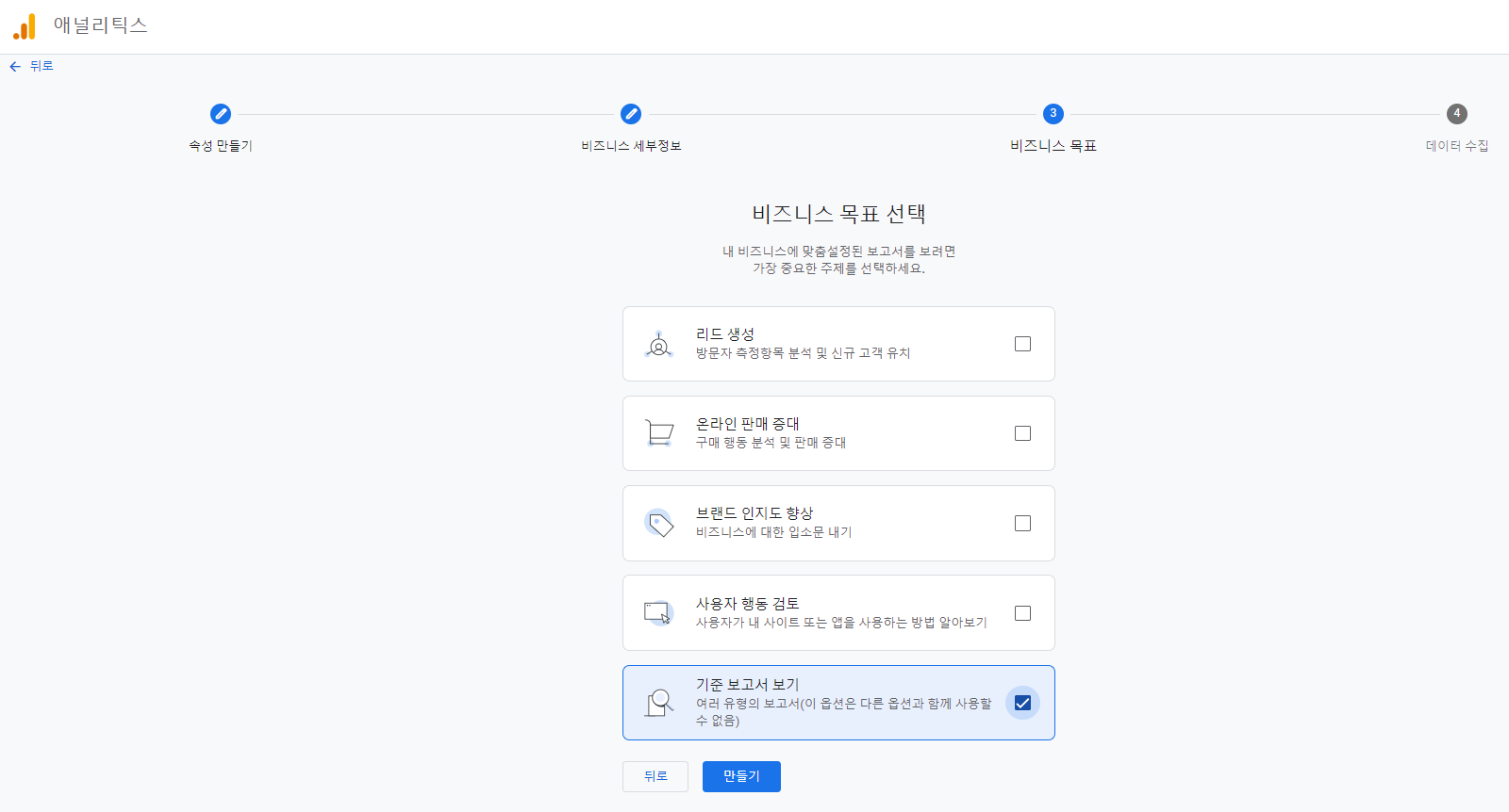 리드 생성, 온라인 판매 증대, 브랜드 인지도 향상, 사용자 행동 검토, 기준 보고서 보기 등에서 체크가 가능합니다. 아무것이나 하나 선택하면 될 것 같습니다.