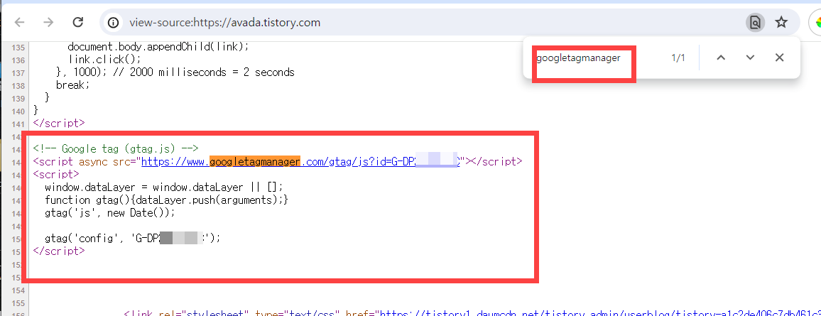 참고로 Google 태그가 제대로 추가되었는지는 구글 크롬 등 브라우저에서 페이지 소스를 체크하여 확인할 수 있습니다. 구글 크롬에서 Ctrl+U를 누르면 페이지 소스가 표시됩니다. Ctrl+F를 눌러 googletagmanager를 검색할 수 있습니다.