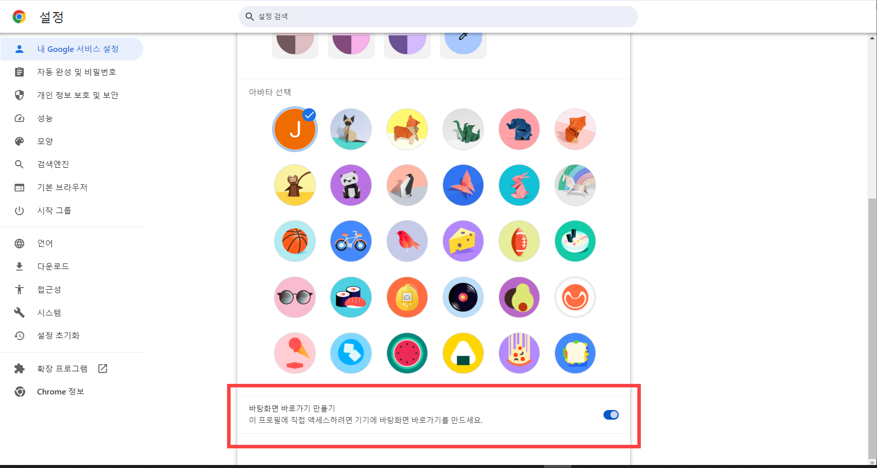 내 Google 서비스 설정 화면이 표시되면 맨 아래의 "바탕화면 바로가기 만들기"를 활성화합니다.