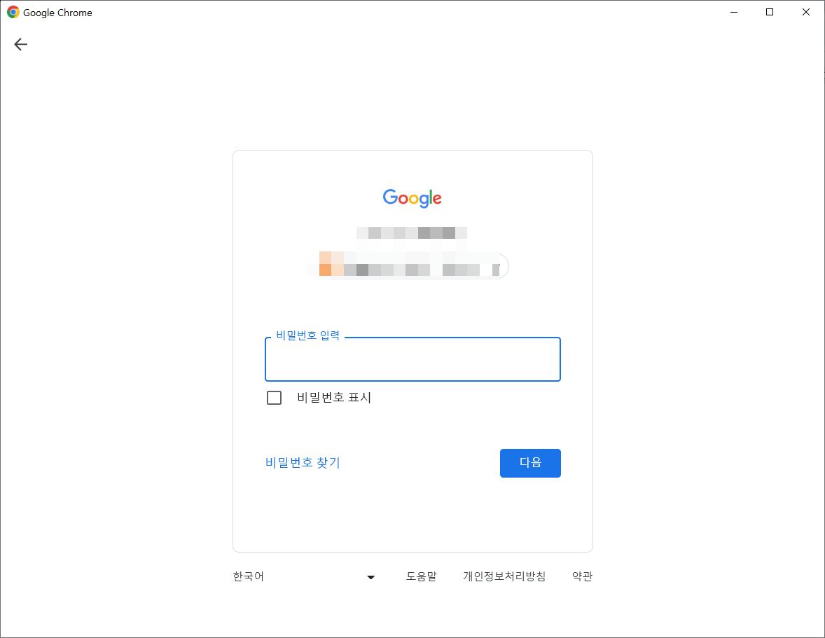 다른 구글 계정에 로그인하려는 경우 로그인 버튼을 클릭합니다. 계정 없이 계속 버튼을 누르면 구글 계정에 로그인하지 않은 상태로 구글 크롬을 실행할 수 있습니다.