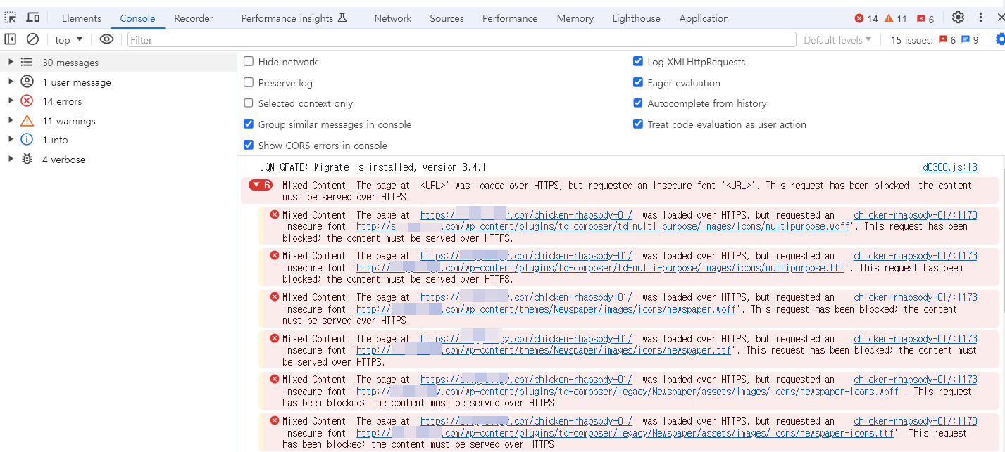 워드프레스 뉴스페이퍼 테마 폰트 로드 오류: Mixed Content 및 404 에러