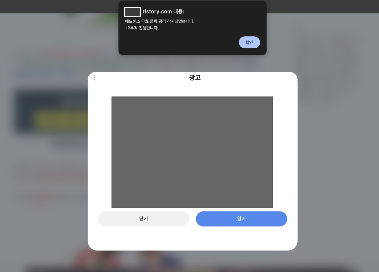 일부 티스토리 사이트에서 애드센스 무효 클릭 공격 감지 팝업을 띄우면서 IP 추적을 시작한다는 섬뜩한(?) 경고를 표시하고 있습니다.