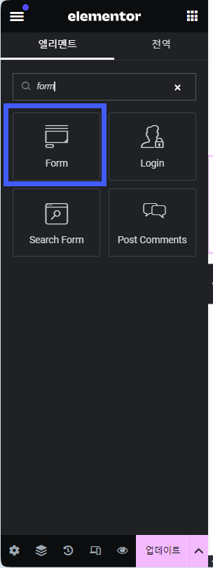 엘리멘터 편집 화면에서 Form 위젯을 원하는 곳으로 끌어다 놓습니다.