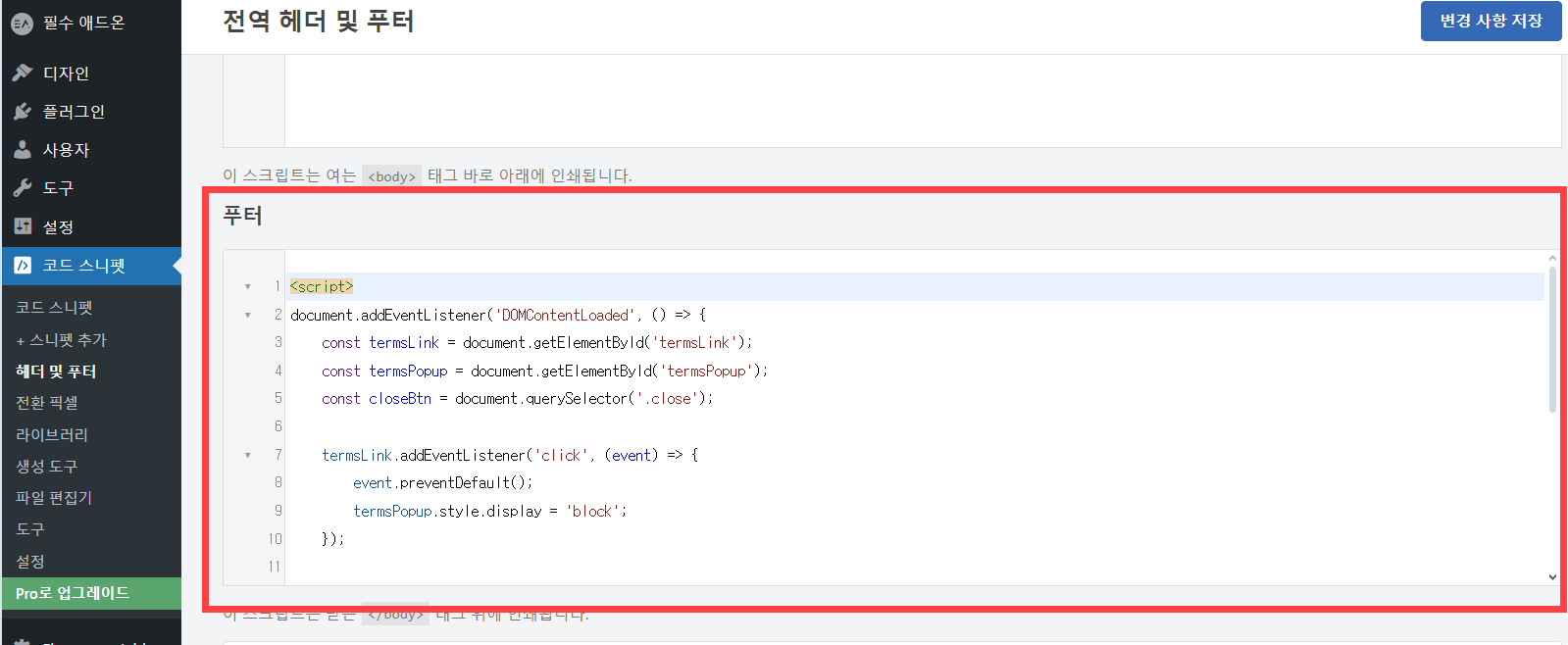 다음 단계로 아래의 자바스크립트 코드를 페이지의 푸터 섹션에 추가합니다.