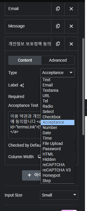 이용약관/개인정보 보호정책 동의 필드를 추가하려면 새 아이템을 추가하고 타입에서 Acceptance를 선택합니다.
