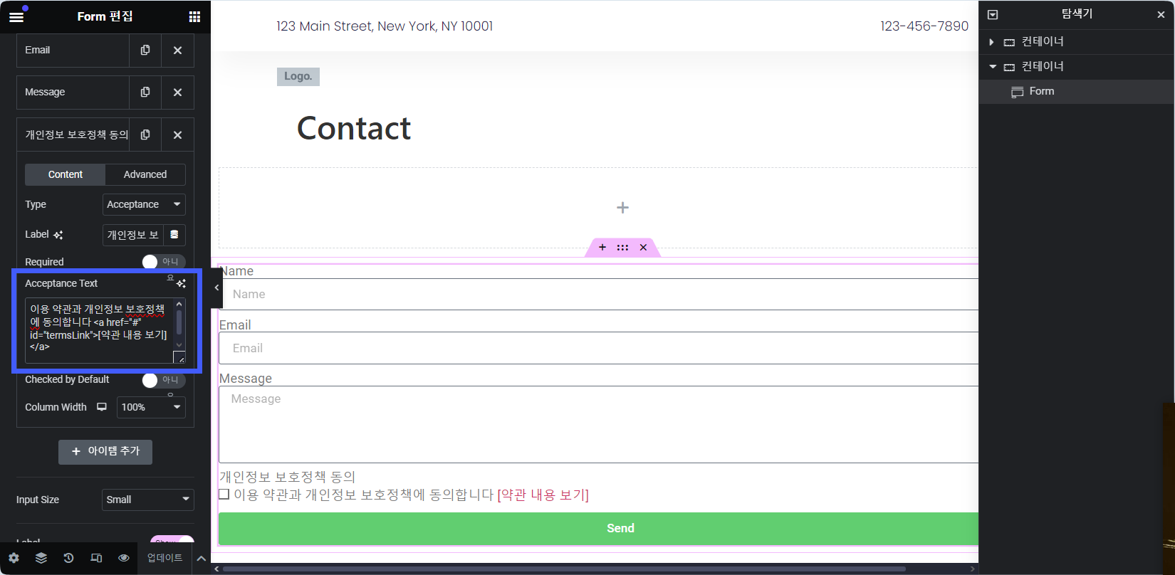 엘리멘터 프로를 사용하는 경우 자체 컨택트 폼(Form) 위젯을 사용하여 사용자들로부터 문의를 받을 수 있습니다. 문의 폼에 이용 약관 또는 개인정보 보호정책 동의 필드를 추가하고 자세한 약관 내용을 팝업 형식으로 표시하는 경우가 많습니다.