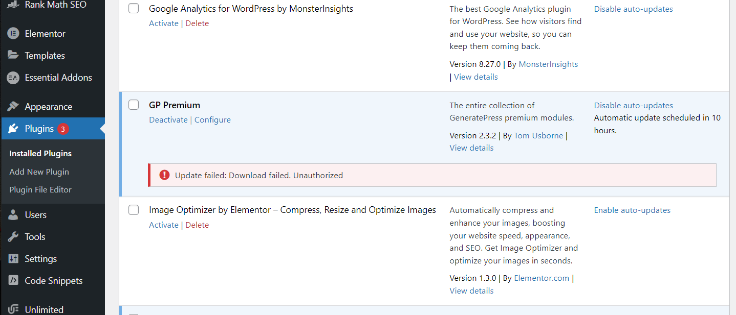워드프레스 GeneratePress 테마의 유료 버전인 GP Premium을 업데이트할 때 "Update failed: Download failed. Unauthorized" 오류가 발생하면 업데이트에 실패하는 경우가 있을 수 있습니다.