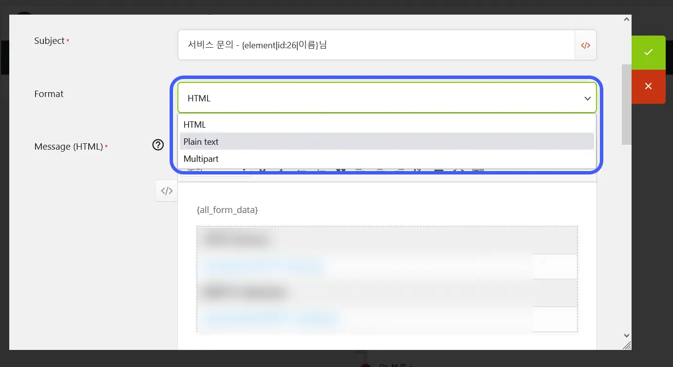 Quform에서는 이메일 포맷을 HTML, Plain text, Multipart 중에서 선택할 수 있습니다. HTML 포맷 대신 Plain text(일반 텍스트)로 바꾸어 보았습니다.
