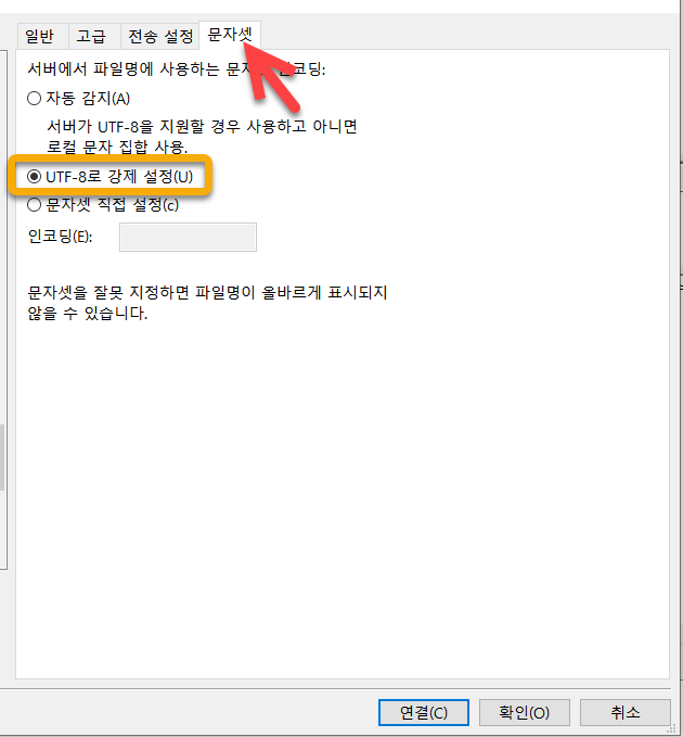 한글 파일 이름이 있다면 먼저 파일 이름에서 한글이 깨지지 않은지 주의해야 합니다. 파일질라 FTP 클라이언트 프로그램에서 문자셋 설정을 "자동 감지" 대신 "UTF-8로 강제 설정"을 선택하면 한글이 깨지는 현상이 발생하지 않습니다.