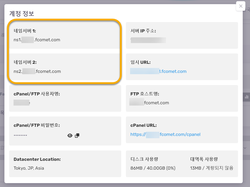 계정 정보 창에서 네임서버 정보를 확인할 수 있습니다.