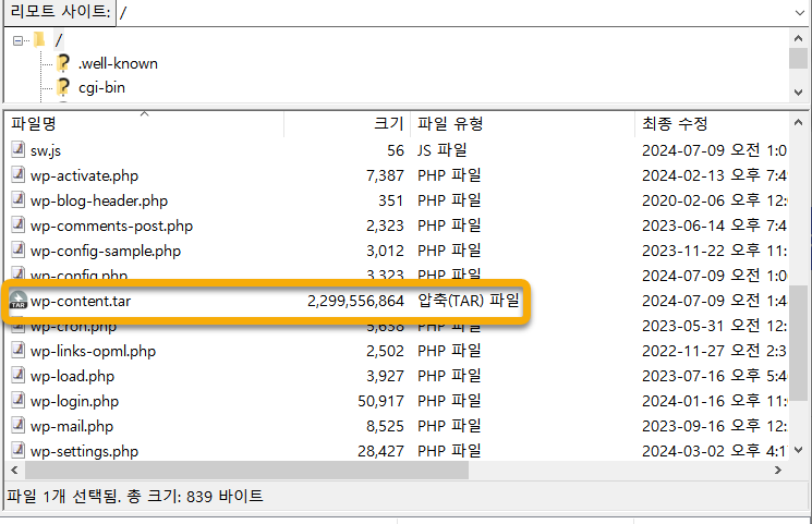 이번 건은 용량이 그리 많은 편은 아니었지만, 파일 개수가 많아서 그런지 가비아에서 다운로드하는 데 15분 내외가 걸렸습니다. 디스크 용량이 아슬하게 부족하여 디렉터리를 압축하지 않고 FileZilla를 통해 SFTP/FTP에 접속하여 다운로드했습니다.
