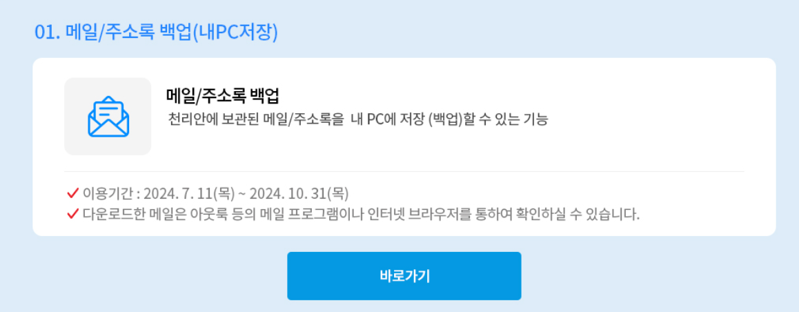 천리안 메일 사용자는 2024년 7월 11일부터 10월 31일까지 다음 서비스를 신청할 수 있습니다.