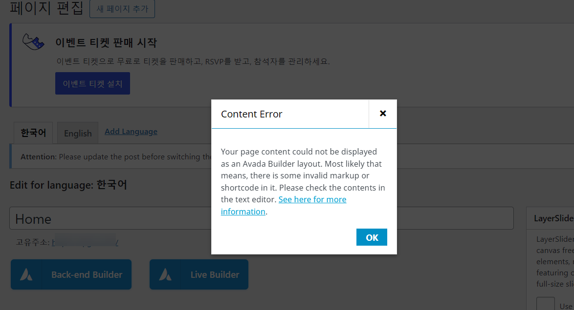 잘못된 마크업이나 숏코드가 페이지에 사용되면 아래 그림과 같이 Content Error가 발생할 수 있습니다.