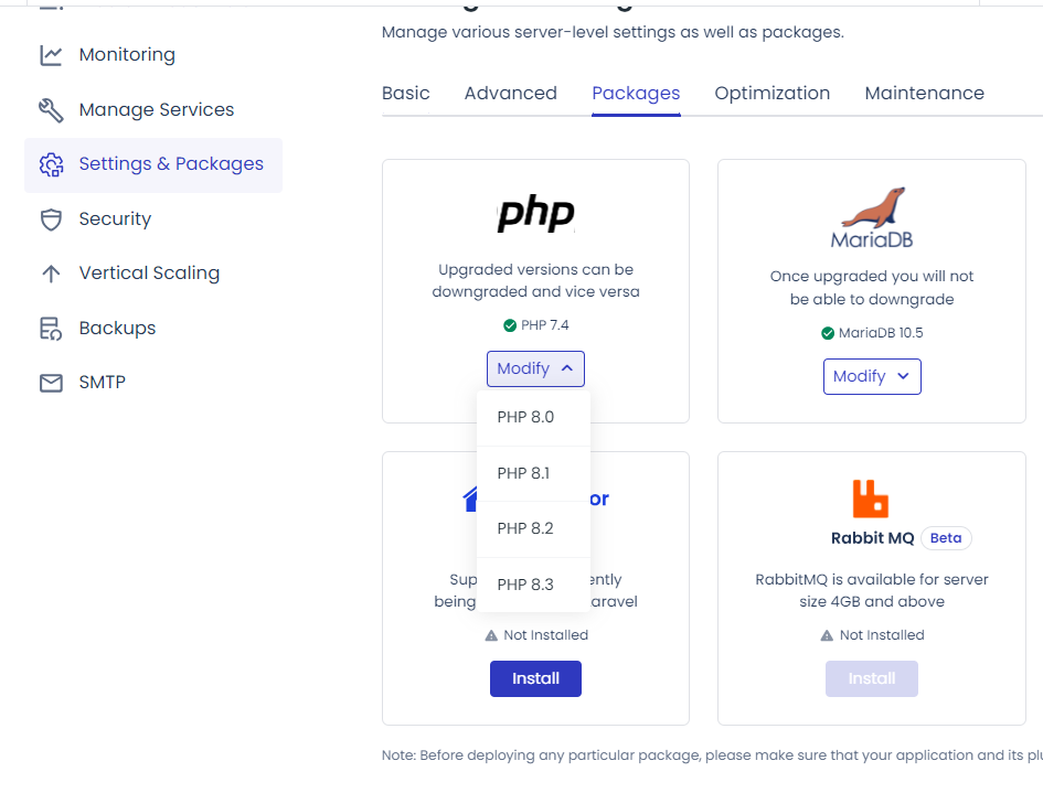 클라우드웨이즈(Cloudways)에 서버를 하나 생성하여 PHP 버전을 7.4로 세팅하여 사이트 복원을 시도했습니다. 클라우드웨이즈에서는 PHP 7.4부터 PHP 8.3 사이의 버전을 선택할 수 있습니다. 가급적 PHP 8.2나 8.3과 같은 최신 버전을 선택하는 것이 바람직하지만, 오래된 사이트를 테스트할 때에는 지원되는 가장 낮은 PHP 버전을 선택하는 것을 고려할 수 있습니다.
