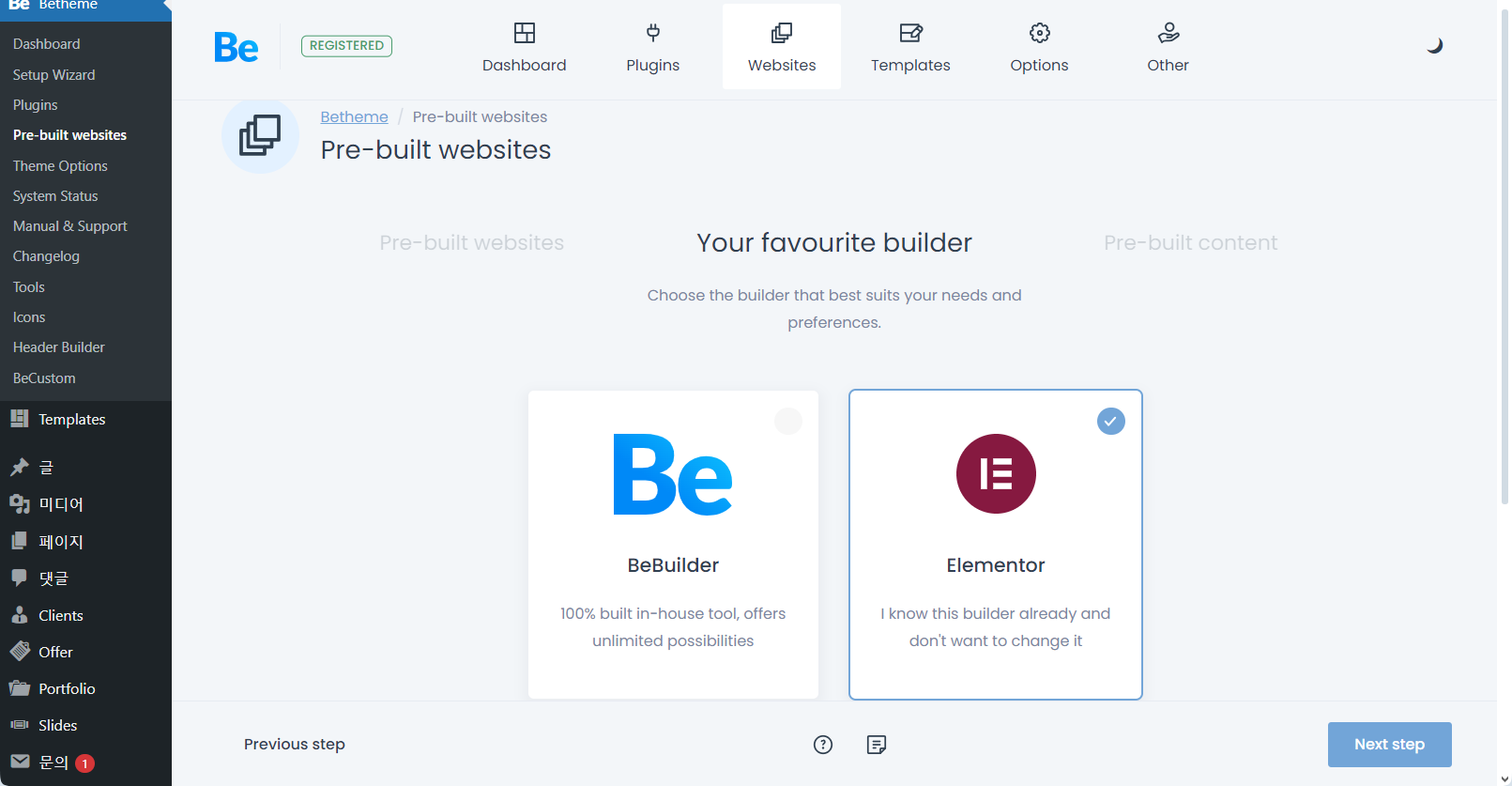속도면에서는 BeBuilder를 사용하는 것이 더 빠를 것 같지만, 편의성면이나 추후 유지관리를 위해 엘리멘터용 데모를 로드하는 것을 고려할 수 있을 것 같습니다. Be 테마를 사용하지 않게 되더라도 엘리멘터로 페이지를 작성할 경우, 다른 테마를 사용해도 페이지를 새로 만들 필요가 없을 수 있습니다. (다만, 아바다나 Divi 등 자체 페이지 빌더가 사용되는 테마를 선택하는 경우에는 해당 페이지 빌더로 새롭게 페이지를 만들어야 합니다.)
