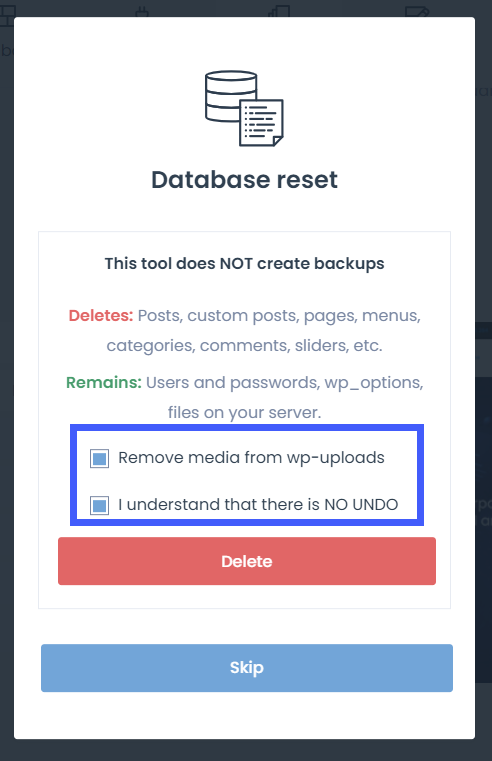 데모를 여러 번 로드하면서 사이트가 꼬인 것 같다면, 데모 로드 시 Database reset 하면에서 Delete 버튼을 클릭하면 기존 포스트, 커스텀 포스트, 페이지, 메뉴, 카테고리, 댓글, 슬라이더 등이 제거되어 초기화됩니다. 또한, Remove media from wp-uploads도 체크할 수 있습니다.