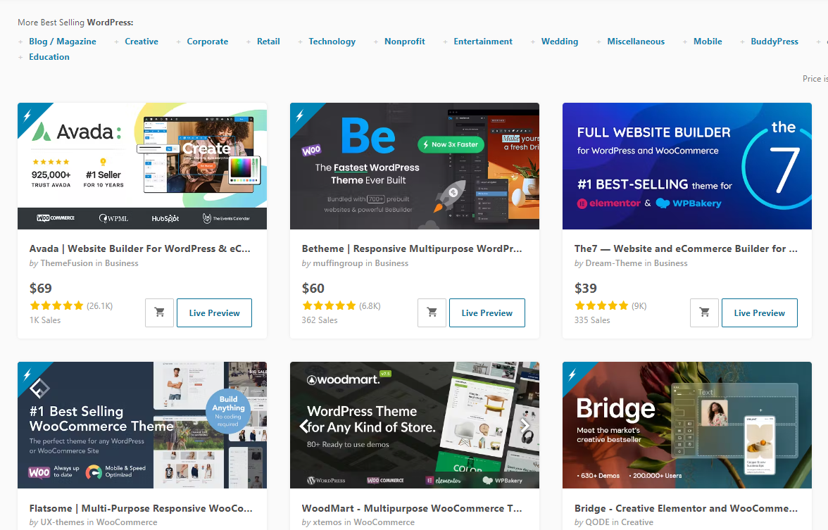 BeTheme의 경우 현재 710개의 사전 제작된 웹 사이트 템플릿이 제공되며, 엘리멘터용은 244개에 달합니다. (쇼핑몰을 운영하려는 경우 우커머스용 데모를 선택할 수 있습니다.)