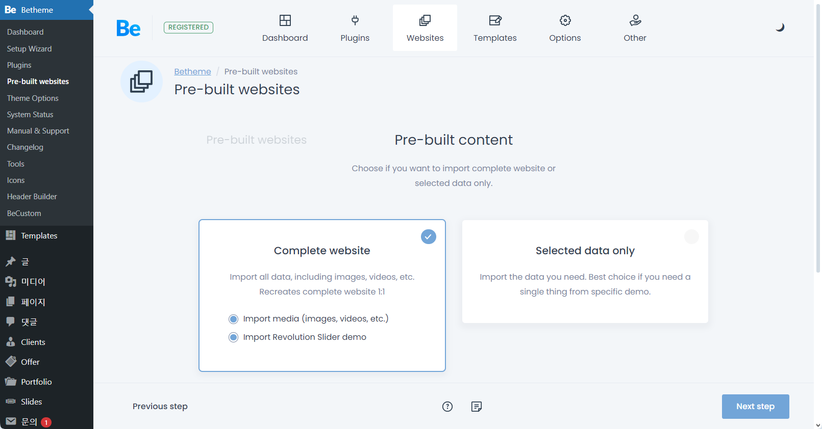 데모가 두 빌더 모두를 지원하는 경우 선호하는 빌더 선택(Your favourite buider)에서 BeBuilder와 Elementor 둘 중에서 하나를 선택할 수 있습니다. BeBuilder만 지원하는 경우에는 위의 화면이 표시되지 않고 곧바로 다음과 같이 모든 콘텐츠를 로드할 것인지, 아니면 일부 데이터만 로드할 것인지 묻는 화면이 나타납니다.