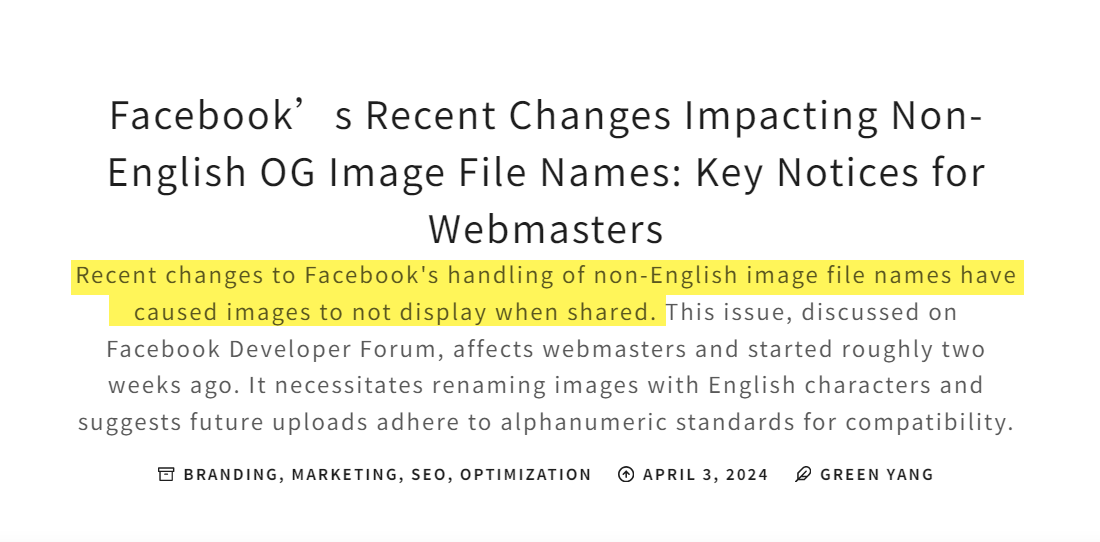 OG 파일 이름에 한국어, 일본어, 중국어 등 비영문 글자가 포함되면 페이스북 공유 시에 썸네일이 깨지는 현상이 발생하고 있습니다. 페이스북은 지난 3월부터 이미지를 처리하는 방식 변경으로 인해 페이스북에 게시글을 공유할 때 OG 파일명에 비영문 문자가 포함될 경우 제대로 표시되지 않고 있습니다.