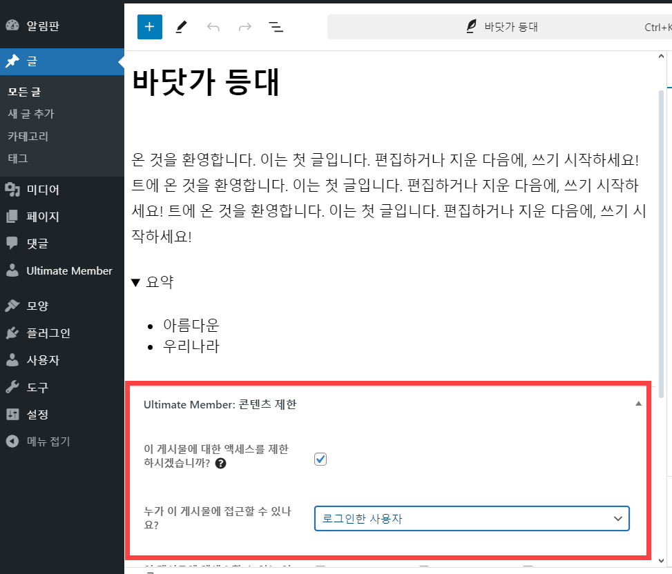 전체 사이트 레벨에서 접근을 제한하는 대신, 특정 글이나 페이지에 대하여 접근 제한을 설정할 수도 있습니다. 접근을 제한할 글/페이지의 편집 화면에서 아래 그림과 같이 설정하면 로그인 사용자만 해당 게시물에 접근할 수 있게 됩니다.