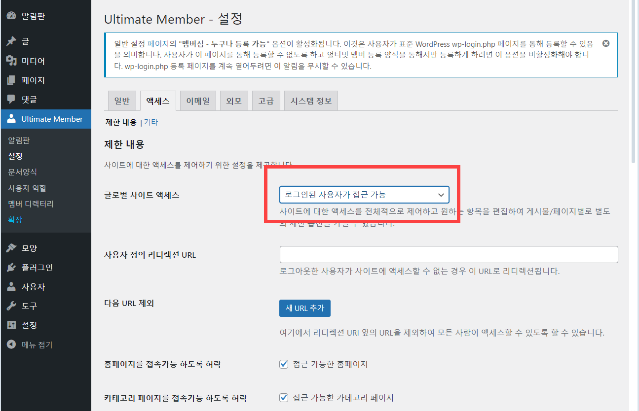 사이트 전에 액세스를 제한하고 싶은 경우 Ultimate Member » 설정 » 액세스 탭으로 이동하여 글로벌 사이트 액세스 옵션을 "로그인된 사용자가 접근 가능"으로 설정하시기 바랍니다.