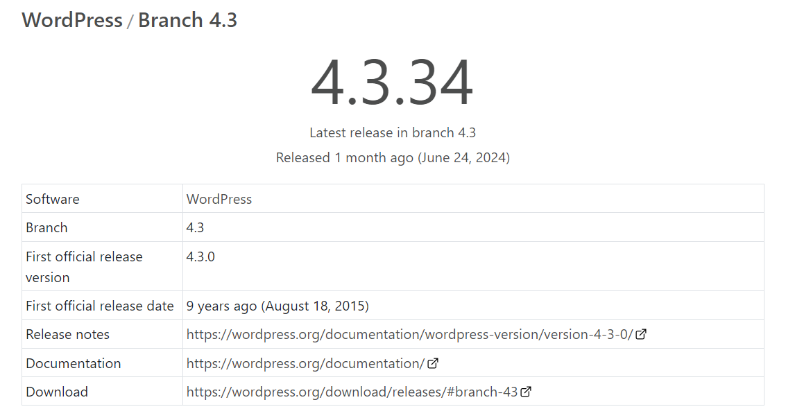 워드프레스 4.3.34 버전은 최근에 릴리스되었지만, 4.3 버전은 9년 전에 공개되었습니다.