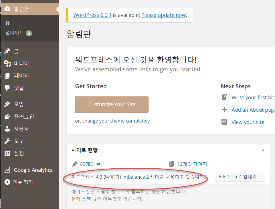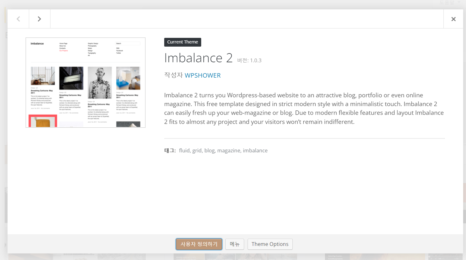 Imbalance 2라는 테마인데요, 2011년 6월에 출시되었고 (무려 13년 전!) 이후로 업데이트가 안 되고 있습니다.😥