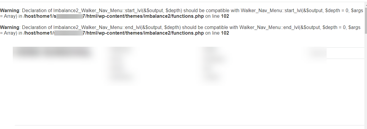 Warning: Declaration of Imbalance2_Walker_Nav_Menu::start_lvl(&$output, $depth) should be compatible with Walker_Nav_Menu::start_lvl(&$output, $depth = 0, $args = Array) in /host/home1/html/wp-content/themes/imbalance2/functions.php on line 102
