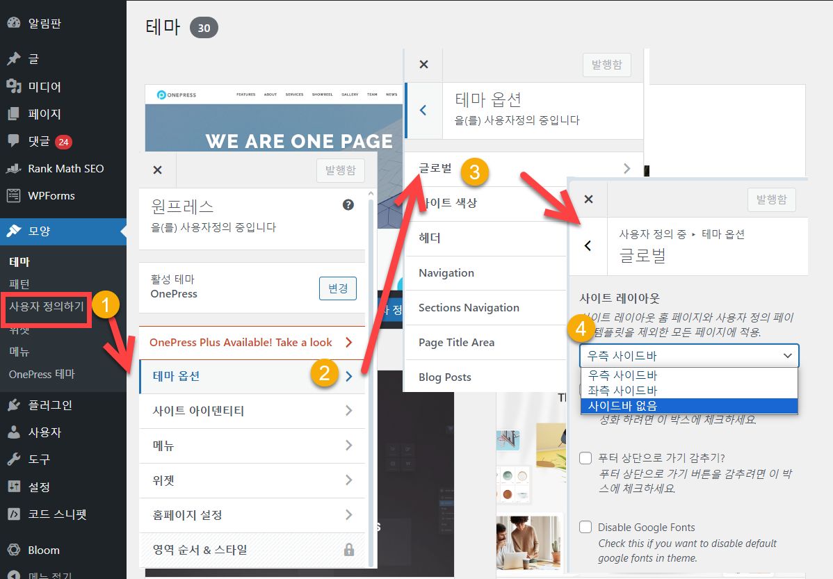 원프레스 테마에서 사이드바를 제거하고 싶은 경우 관리자 페이지 » 모양 (워드프레스 버전에 따라 외모, 디자인) » 사용자 정의하기 » 테마 옵션 » 글로벌로 이동합니다.