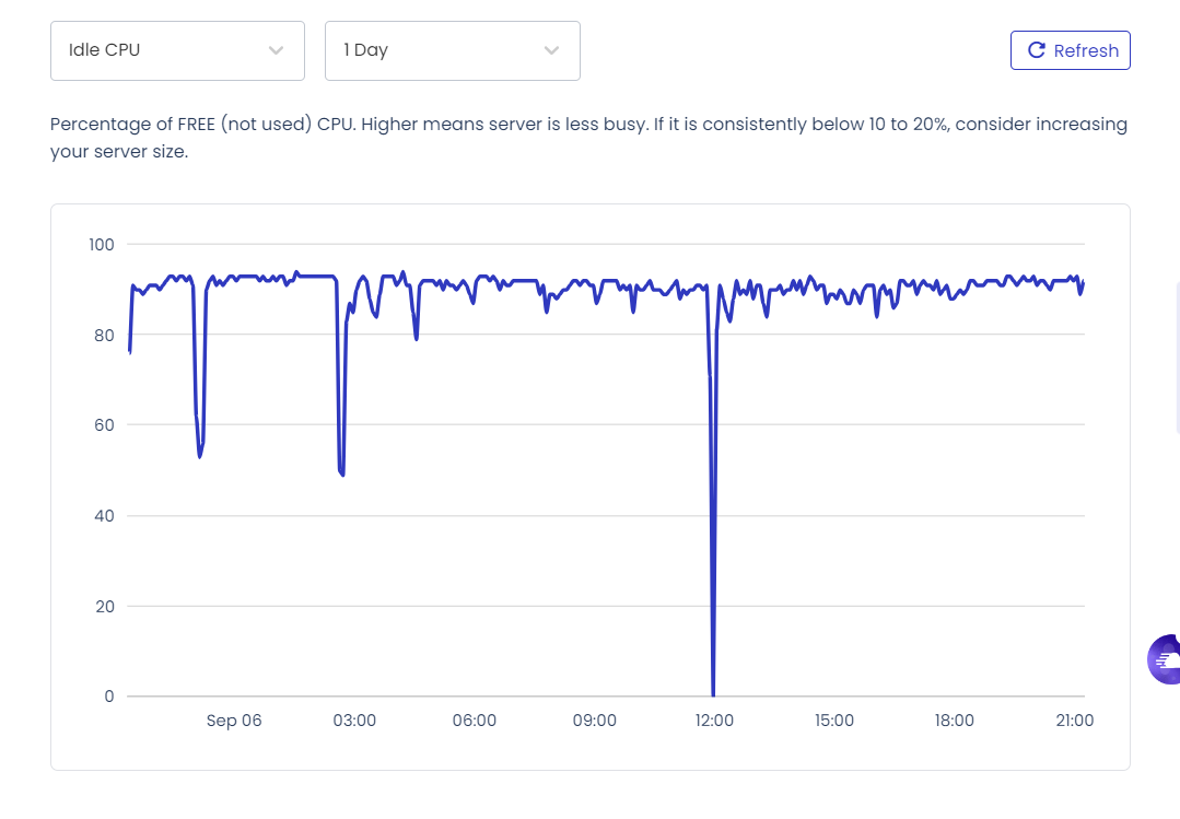 클라우드웨이즈의 모니터링 페이지를 체크해 보니 12시경에 CPU 사용량이 급증했다가 곧 정상화되는 것을 확인할 수 있습니다.