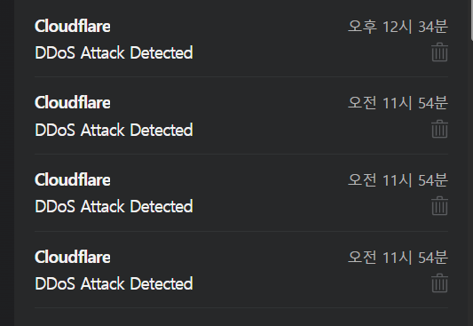 오늘은 오전 11시 54분에 디도스 공격이 감지되었다는 메일이 날아왔습니다. 연거푸 4개의 알림 메일을 받았습니다.