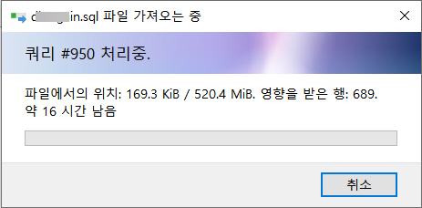 저는 HeidiSQL을 사용하여 DB 임포트를 시도하니 16시간이 소요된다고 표시되네요.ㅠㅠ