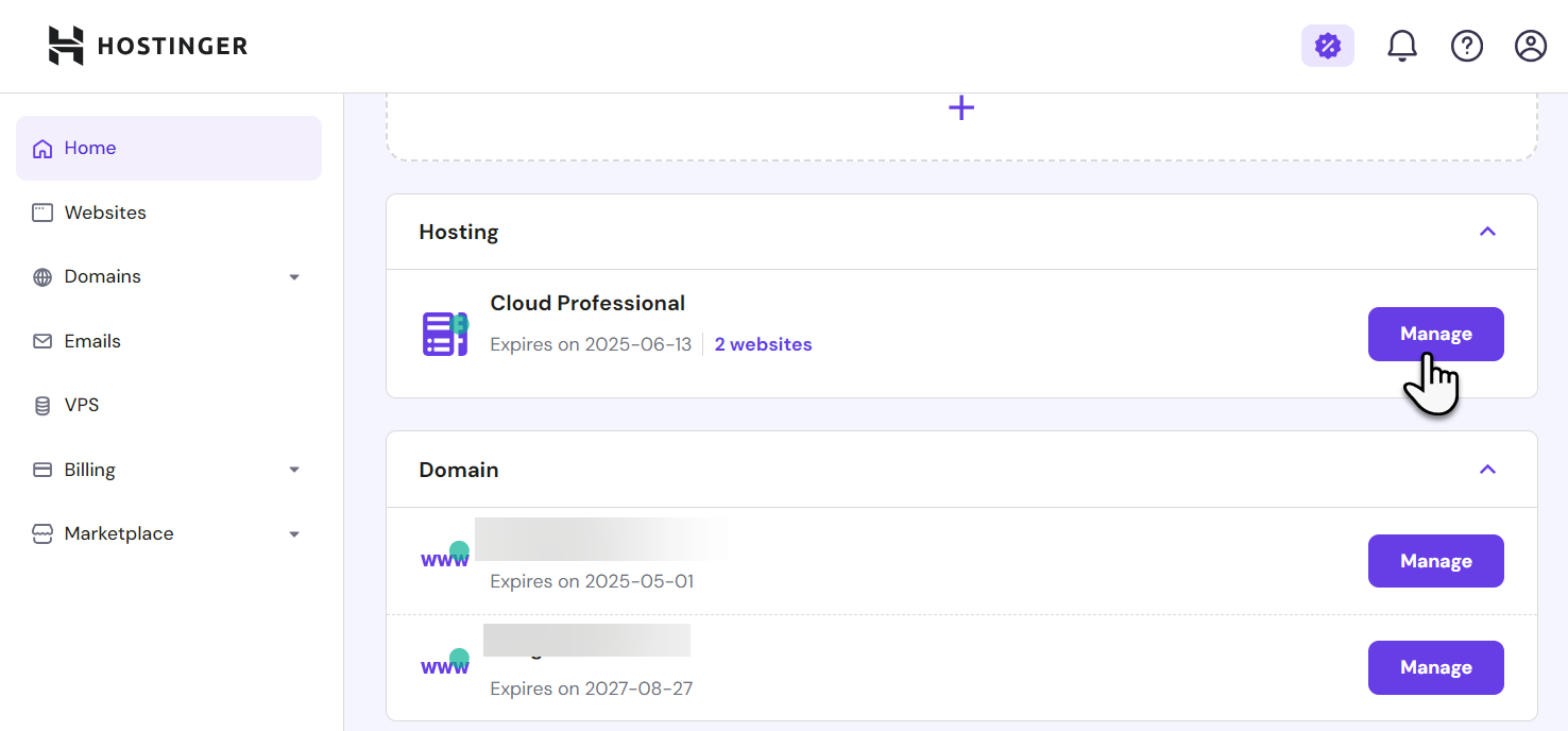 1. 호스팅어에 로그인한 후에 Home » Hosting 섹션에서 해당 호스팅 상품의 Manage 버튼을 클릭합니다.
