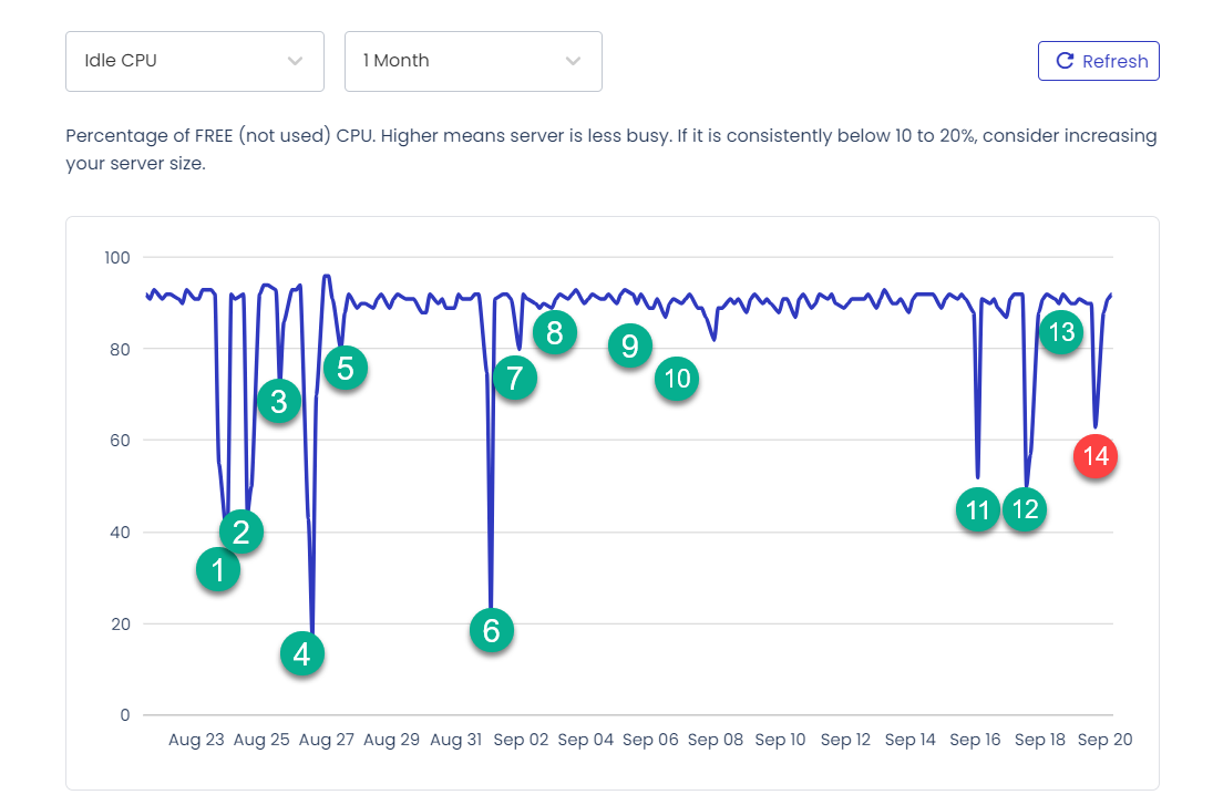 클라우드웨이즈(Cloudways)의 Idle CPU 모니터링 페이지에서 지난 한 달 동안 발생한 디도스 공격의 흔적을 확인할 수 있습니다.