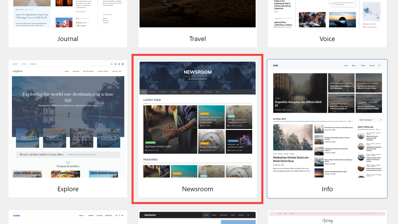 GeneratePress 테마는 우리나라에서 수익형 블로그에 많이 사용되고 있습니다. 사이트 라이브러리에서 다양한 블로그 관련 템플릿을 제공하고 있습니다. 전면 페이지에 카테고리별로 글들을 나열하려는 경우 뉴스룸(Newsroom) 스킨을 선택할 수 있습니다.