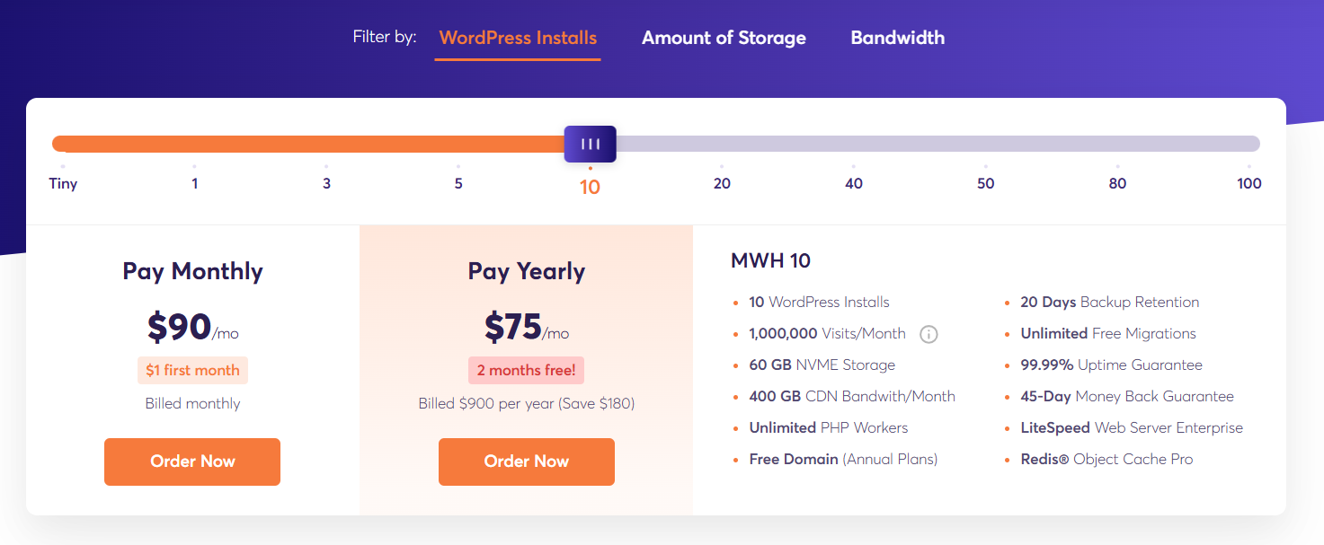 케미클라우드는 서울 서버를 지원하므로 서울 리전을 선택하면 우리나라에서도 속도가 빠릅니다. 예를 들어, MWH 10 플랜의 경우 10개 워드프레스 사이트까지 설치가 가능하고 월 100만 방문 수(대략적인 수치이며 실제로는 더 많은 방문 수 가능)를 수용할 수 있습니다.