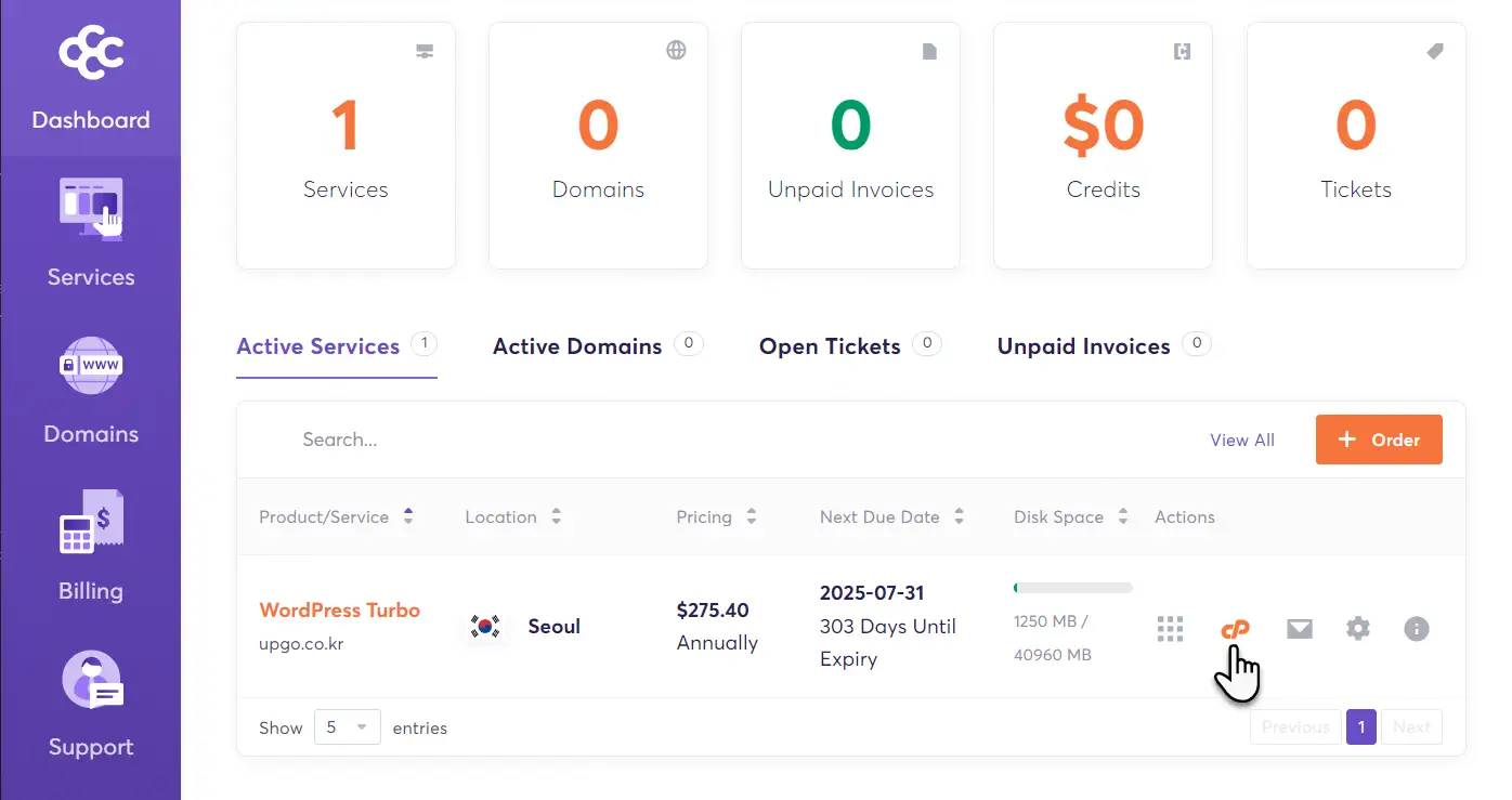 케미클라우드에 로그인한 다음, cPanel 아이콘을 클릭하여 cPanel에 접속할 수 있습니다.