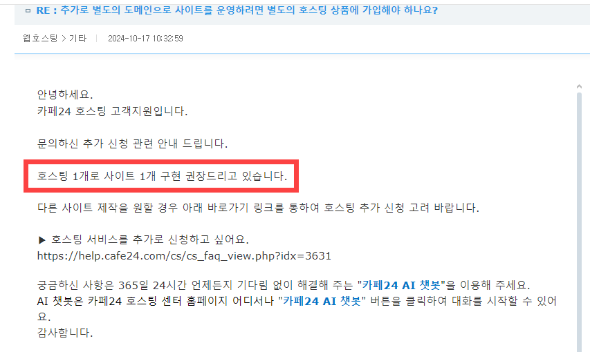 그리고 두 개 이상의 사이트 운영이 가능한지 물어보니 "호스팅 1개로 사이트 1개 구현 권장"한다는 답변을 들었습니다.