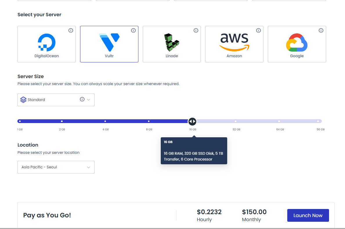 저는 클라우드웨이즈에서 Vultr 서버를 생성하여 이용하고 있는데요. 16GB 램의 경우 Vultr에서는 32GB SSD 디스크, 5TB 트래픽을 제공하며 월 150달러 수준이고, High Frequency를 선택하면 월 173달러 수준입니다. 카페24의 경우 VAT 포함하면 22만원이므로 비슷한 수준이라 생각할 수도 있을 것입니다.