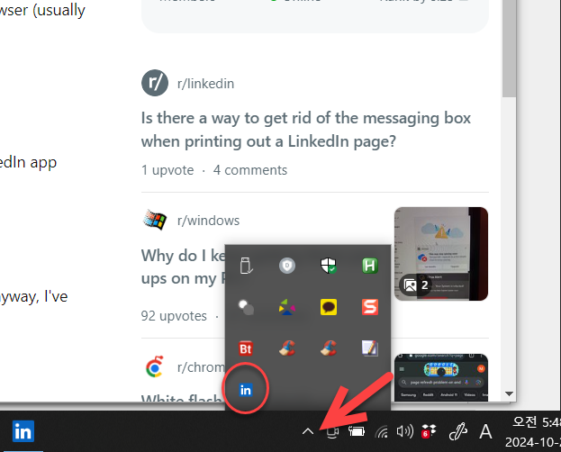 알림을 해제하려면 윈도우 오른쪽 하단의 ^ 화살표를 클릭하고 LinkedIn 아이콘에 마우스를 대고 오른쪽 버튼을 클릭합니다.