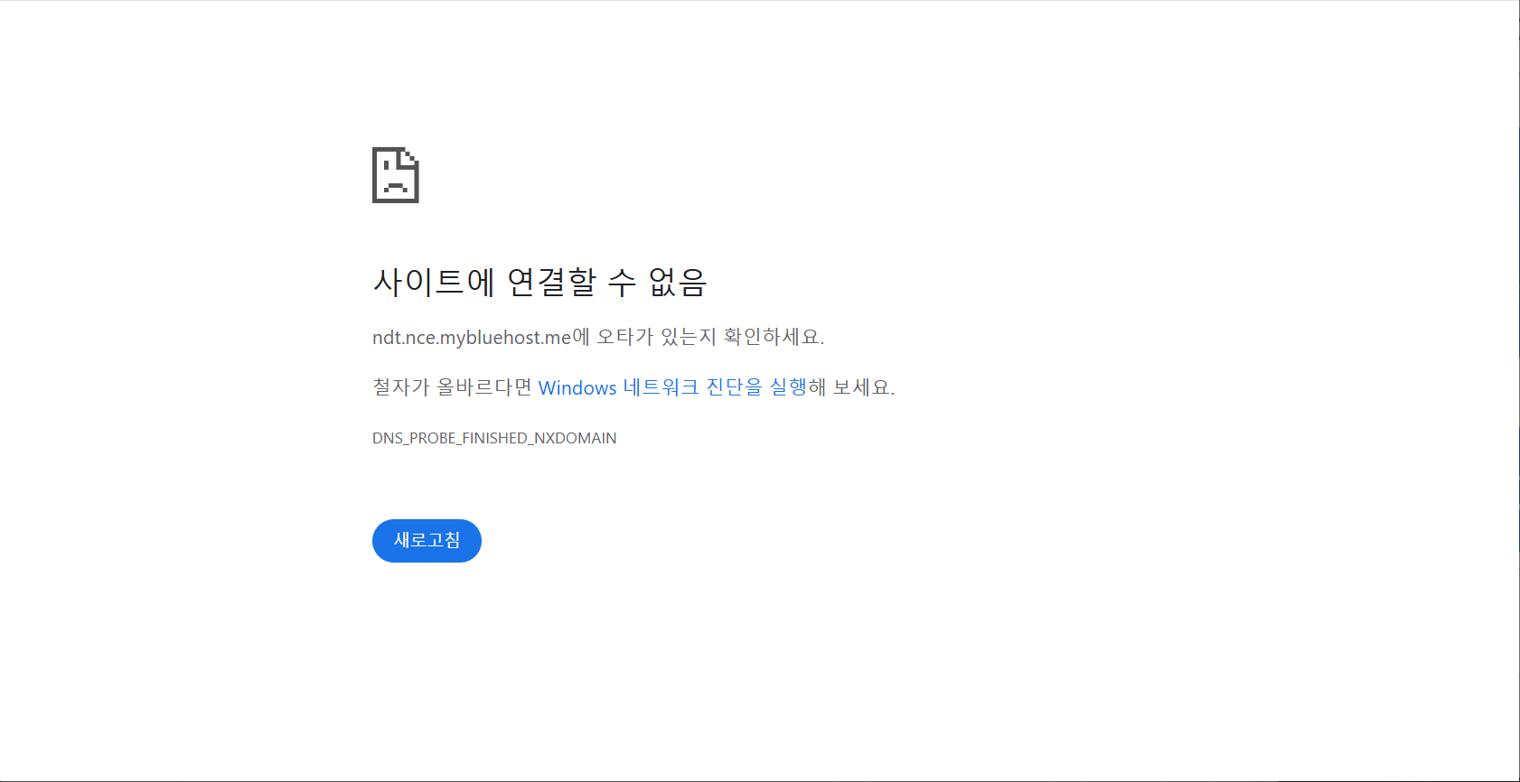 하지만 블루호스트 임시 도메인(example.mybluehost.me/...)은 우리나라에서 접속 시 DNS_PROBE_FINISHED_NXDOMAIN 에러가 발생합니다.